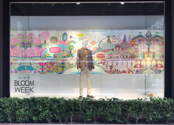 テキスタイルデザイナーユニットの「炭酸デザイン室」さんに光に向かってのびのびと生きる植物と、私たちが暮らす街並みを重ね合わせたイメージでイラストを描いてもらいました。タイトルは「植物の道」。6面のウィンドウの背面にバナーを吊り、イラストが全て繋がって見えるように表現。イラストの楽しい世界感とファッションに統一感が出るようにバランスを意識して演出しました。