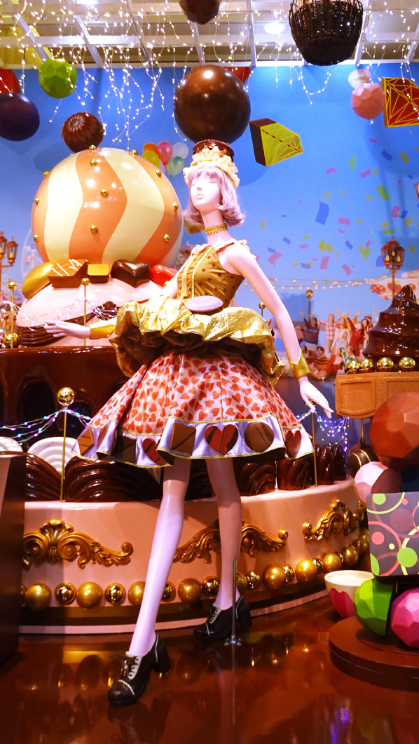 2024年のテーマは、“ショコラパレードで気分は最高潮。ショコラパークに訪れたお客さまをオリジナル衣装を纏ったダンサー達がお出迎えしています。パレードの乗り物やショコラモチーフのアトラクションをイメージしたカラフルな装飾は、回転動力と光演出も加わり、テーマパーク気分をさらに盛り上げます。ファッション性とエンターテインメント性を融合させ、年に一度のショコラの祭典を華やかに演出しました。