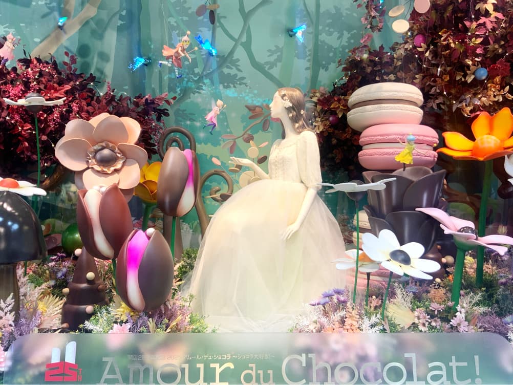 メインステージではオリジナルストーリーとイラストの世界観を、チョコレートの森で表現しました。可愛らしい動物や妖精、チョコでできた花々が、主人公をやさしく包み込むようなイメージで作成。さらにチョコの魔法にかかった森がプロジェクター&プロペラディスプレイのデジタル演出によって、まるで生きているかのような輝きを放ちます。ボタンを押すとモニターにパティシエたちのメッセージが表示される仕掛けもあり、開店25周年にふさわしい華やかなディスプレイとなっています。