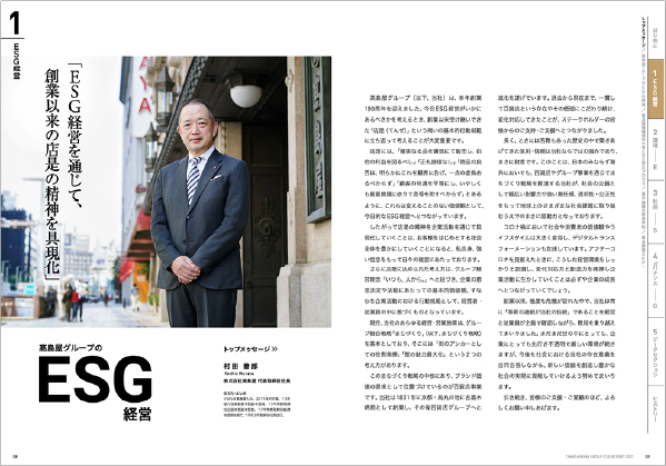 社会的なESG投資への関心の高まりを背景に発行される、高島屋の中長期的な事業活動報告や非財務情報開示を目的とするレポートです。主には対投資家向けの媒体となりますが、最終的には全ステークホルダーにも理解が進むよう制作を意識。一見難解に思える内容を、編集やデザインの工夫で、端的に、親しみやすい表現となるよう心がけました。