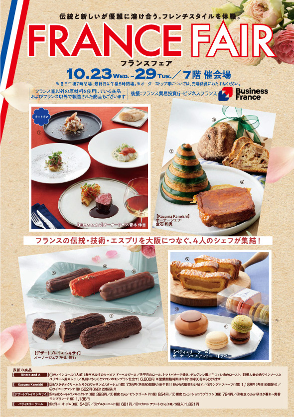 第2回フランスフェアの媒体を制作。 今回は表紙から本場フランスの伝統・技術・エスプリを大阪につなぐ4人のシェフをフューチャーするなど、全体的に食を打ち出す誌面作りに。 その他、雑貨・ファッション等は背景や文字色を変えてメリハリをつけています。