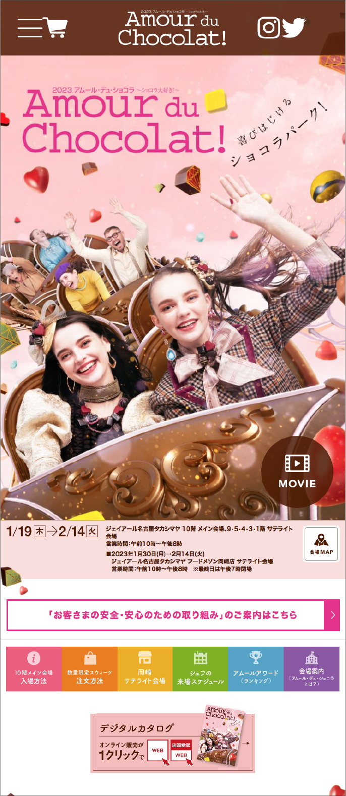 2023年のテーマは、“喜びはじけるショコラパーク”。大好きなショコラやショコラティエたちとの出会いに急上昇するときめきを、ジェットコースターの高揚感に見立て、ビジュアルに落とし込みました。また、回遊性と利便性の高いサイトを目指し、入場方法の説明をはじめ、ショコラ検索やシェフの来場予定、SNSなどを分かりやすくまとめています。