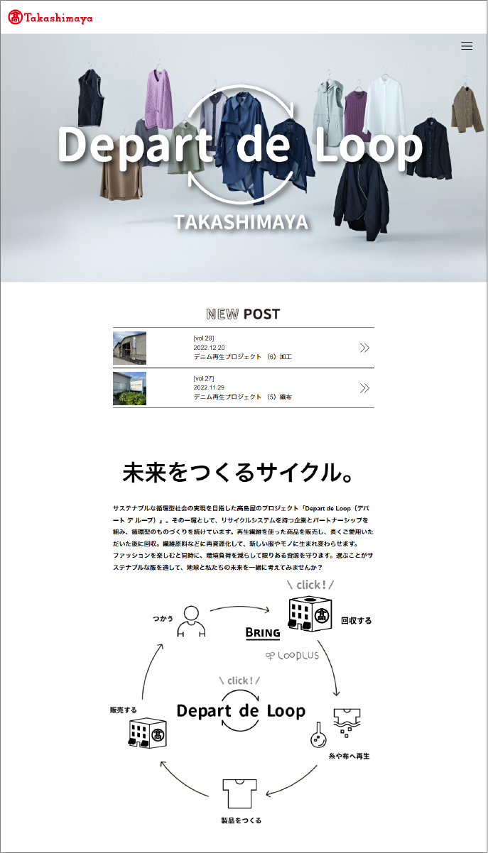 サステナブルな循環型社会の実現を目指した高島屋のプロジェクト「Depart de Loop(デパート デ ループ)」。ファッションを楽しむと同時に、環境負荷を減らして限りある資源を守る活動を、シンプルなデザインと写真の構成、バイヤー発信ブログの設置、ミニマムに図式化した説明により、複雑な循環型プロジェクトをより分かりやすく広く伝えています。回収における総力も着実に増え少しづつ活動が定着しています。